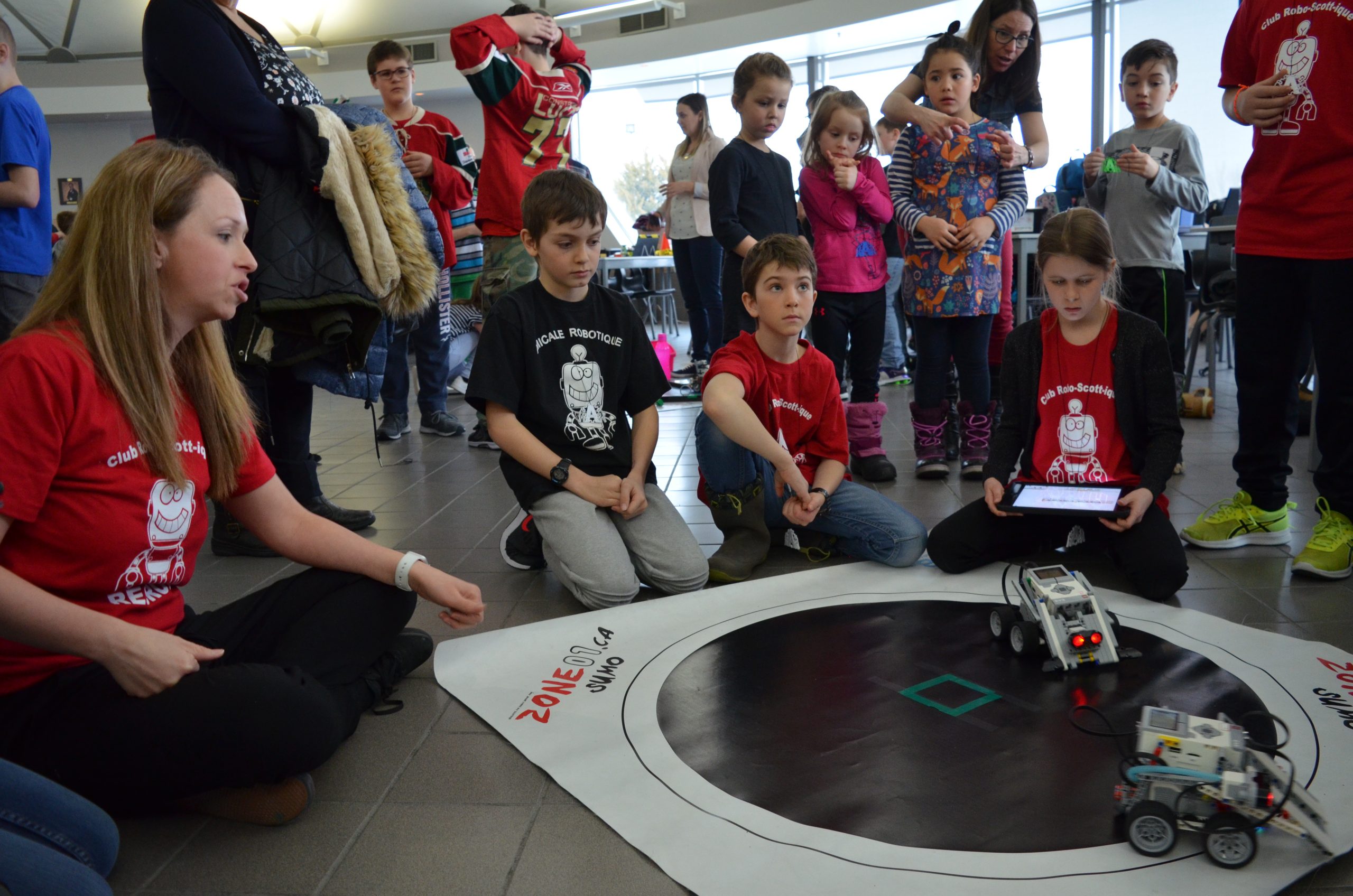 Les élèves juniors, de 9 à 12 ans, relevaient les défis Sumo-Confrontation et 3e Alarme. Sumo-Confrontation était un combat de robots programmés, sur une scène circulaire, pour protéger une plate-forme pétrolière.